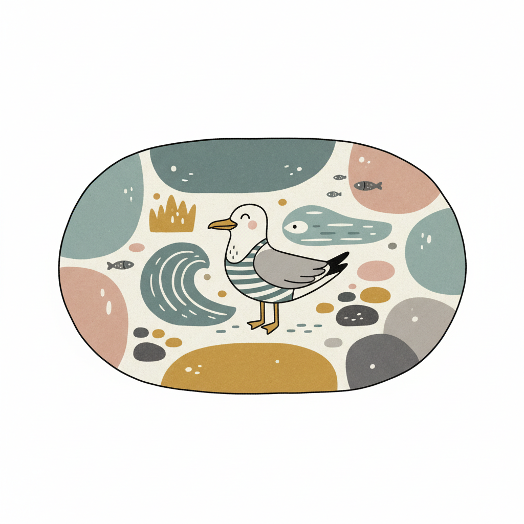 Niedliche Cartoon-Möwe in gestreiftem Shirt auf einem stilisierten Strand mit Wellen und Fischen.