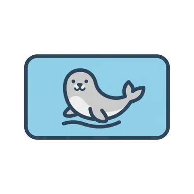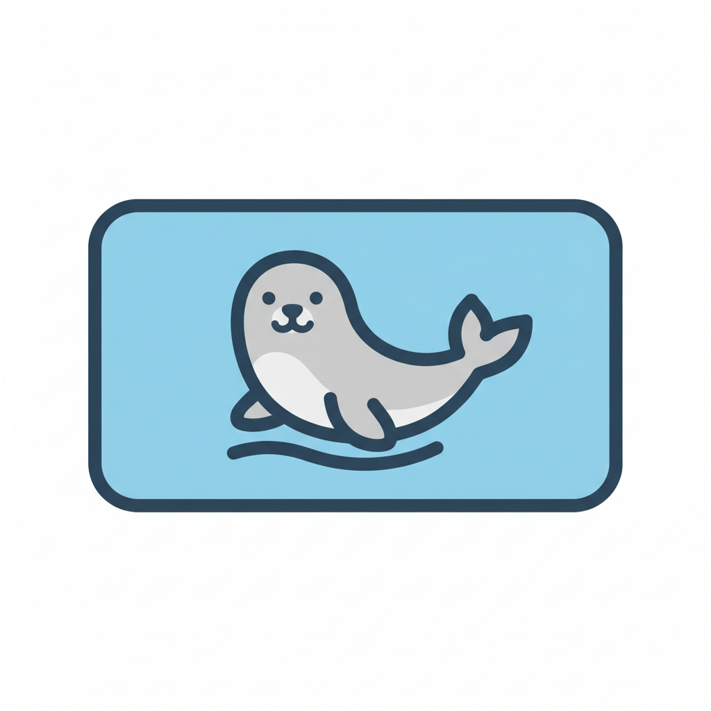 Niedliche Cartoon-Robbe schwimmt in blauem Wasser, umrandet von einem dunklen Rahmen.