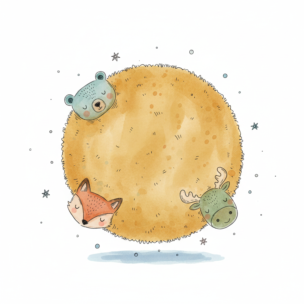 Süße Tierköpfe (Bär, Fuchs, Elch) um einen flauschigen, gelben Planeten in Aquarell-Stil.