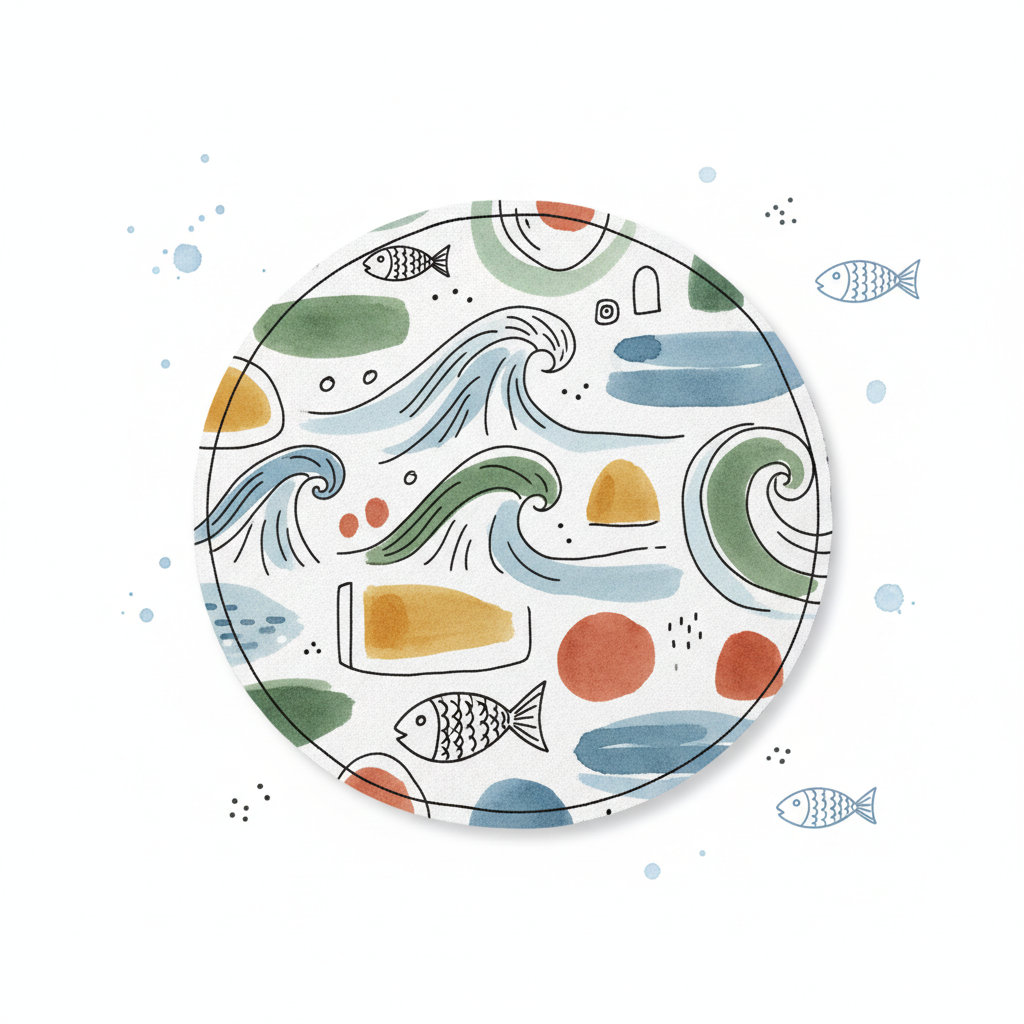 Aquarell-Illustration eines Meeresmotivs in einem Kreis mit Wellen, Fischen und abstrakten Elementen.