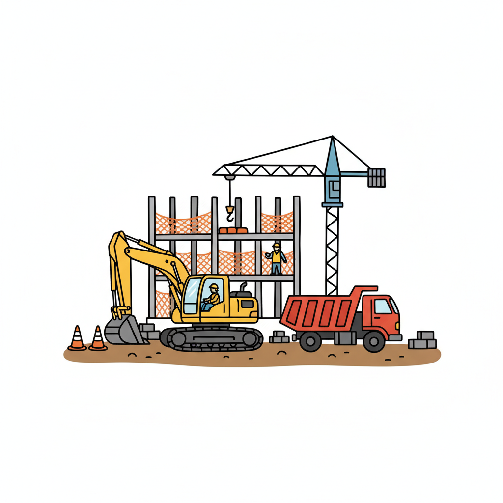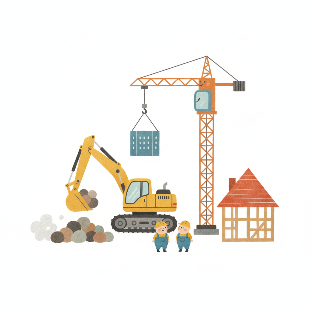 Cartoon-Illustration einer Baustelle mit Bagger, LKW, Kran und Arbeitern beim Bau eines Gebäudes.