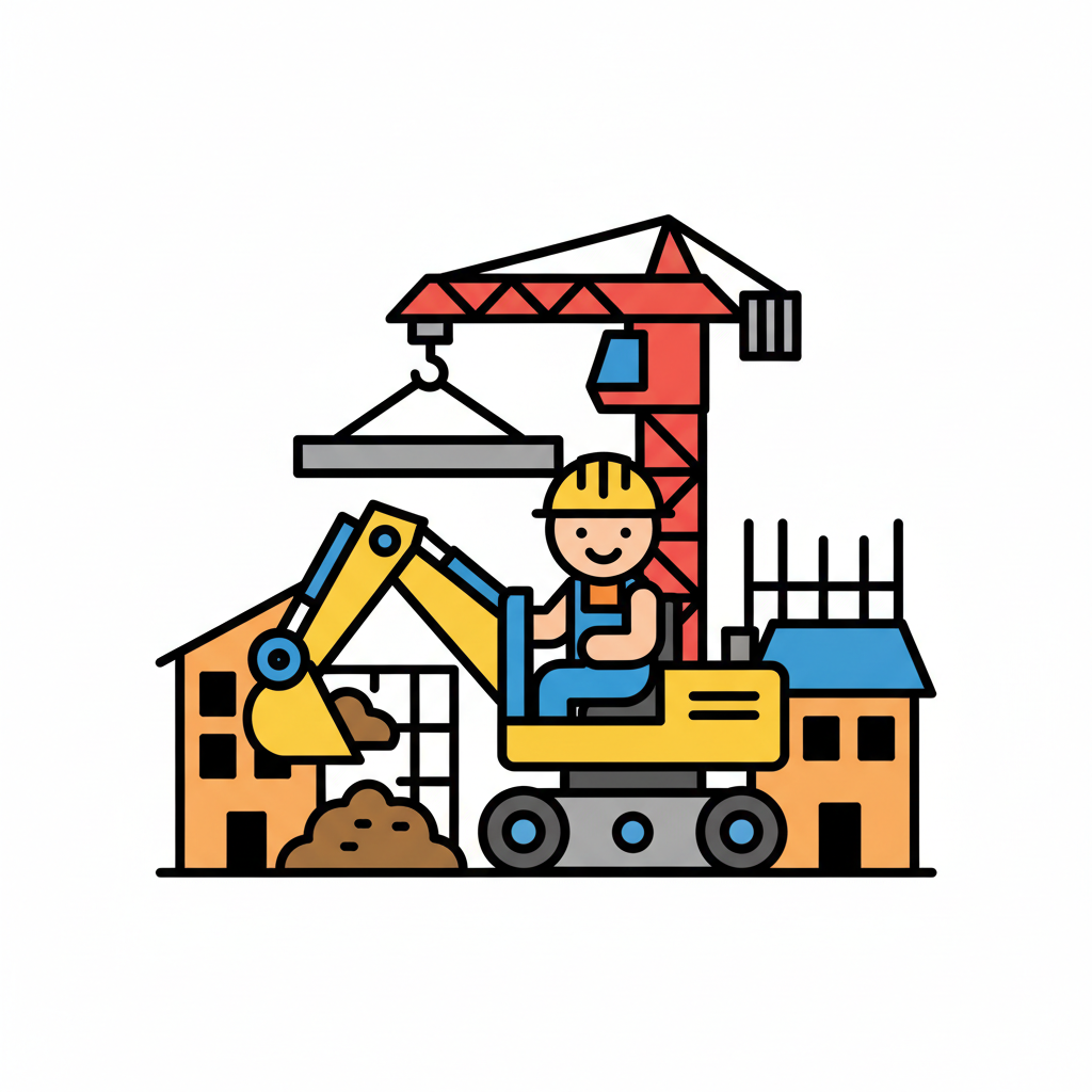 Niedliche Baustellen-Illustration mit Bagger, Kran, Bauarbeitern und einem Haus im Bau.