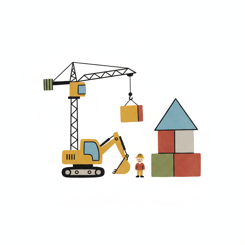 Kindliche Illustration einer Baustelle mit Kran, Bagger, Bauarbeiter und Bauklotz-Haus.