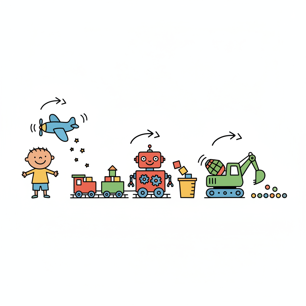 Bunte Kinderzeichnung: Junge spielt mit Flugzeug, Zug, Roboter, Bauklötzen und Bagger.