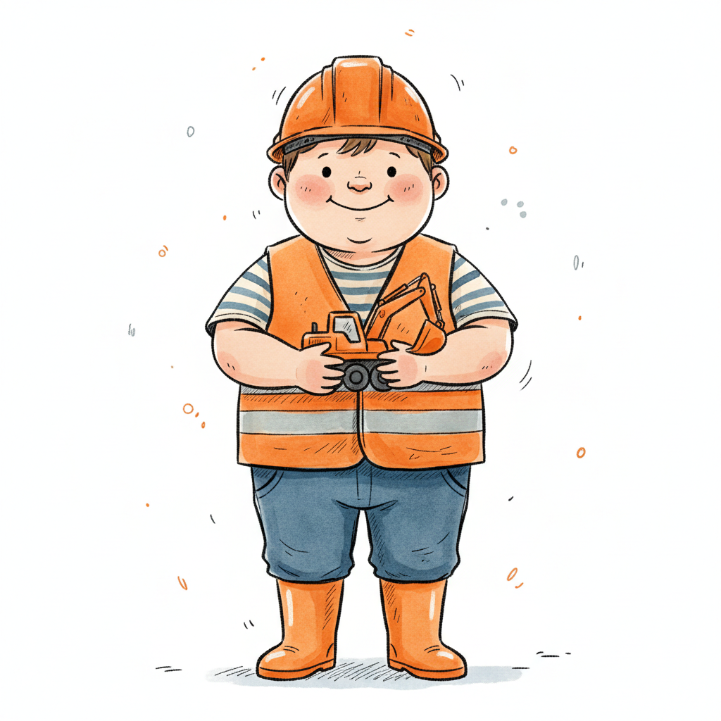 Ein lächelnder Cartoon-Junge in Bauarbeiterkleidung hält einen Spielzeugbagger.
