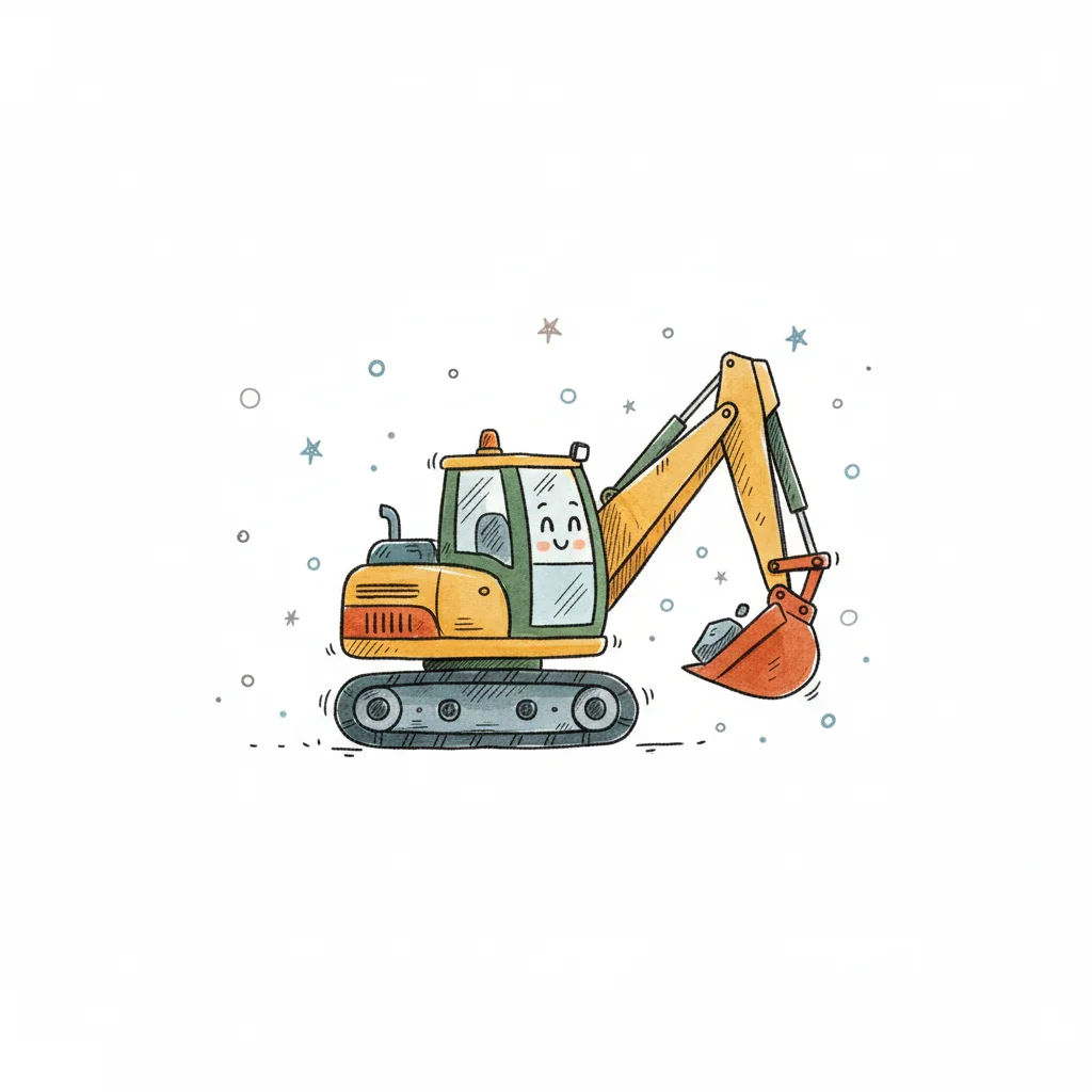 Niedlicher Cartoon-Bagger mit lächelndem Gesicht und einem Stein in der Schaufel, umgeben von Sternen.