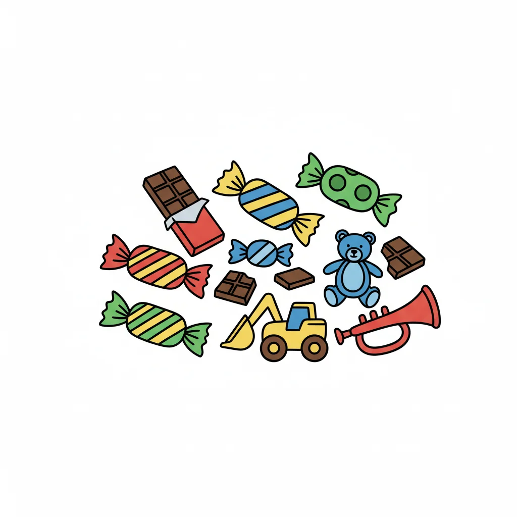 Bunte Illustration von Süßigkeiten, Schokolade und Spielzeug wie Bagger, Teddy und Trompete auf Weiß.