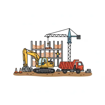 Illustration einer Baustelle mit Bagger, Kran, Bauarbeiter und im Bau befindlichen Gebäuden.