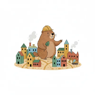 Niedliches Murmeltier mit Bauhelm und Schaufel in einer bunten Stadt mit Häusern und Bagger.