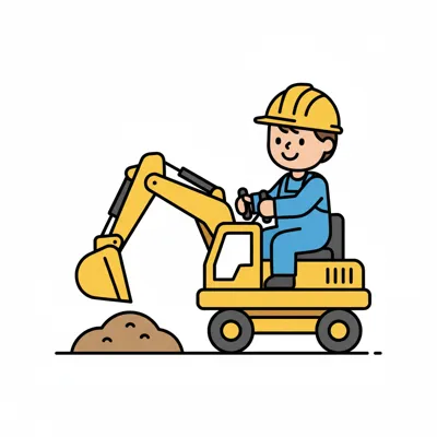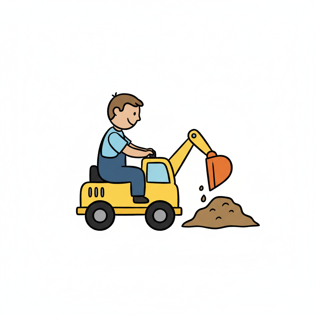 Cartoon-Mann fährt gelben Bagger und schaufelt Erde. Einfache, kinderfreundliche Illustration.