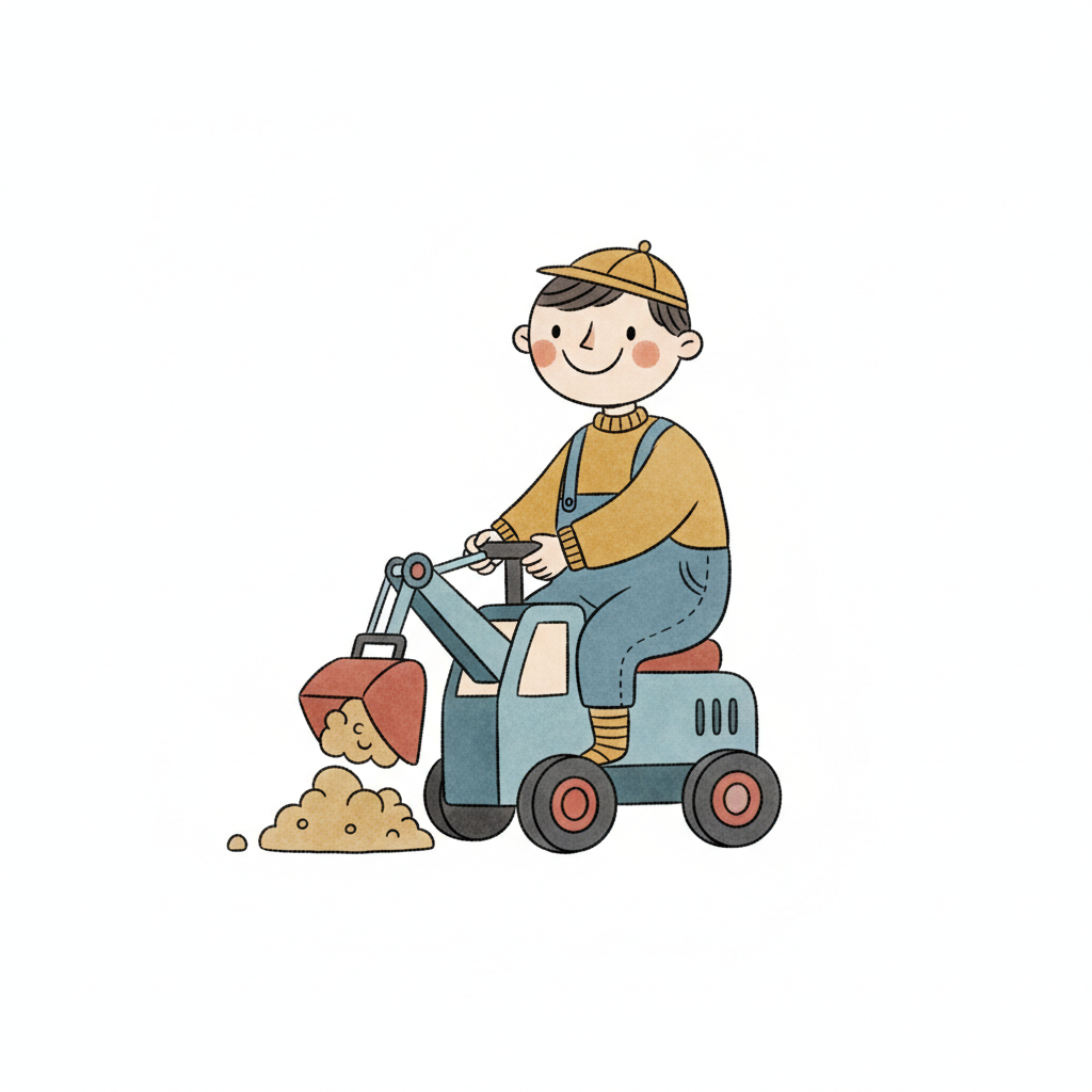 Ein lächelnder Junge in Latzhose spielt mit einem Spielzeugbagger und schaufelt Sand.