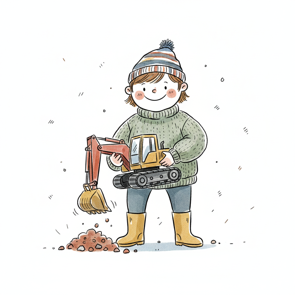 Niedliche, kindgerecht illustrierte Szene mit einem Kind oder einer Person als Hauptfigur, vor rein weißem Hintergrund, im frech-nordischen Aquarell-Skizzenstil. Klare, leicht wackelige Tuschekonturen, sichtbare Pinsel- und Strichtextur, dezente Schraffuren, weiche handgemalte Farbflächen in gedeckten Farben. Einfache, runde Formen. Keine harten Schatten, sondern sanfte, transparente Aquarellschichten. Leicht raue, handgezeichnete Linien statt glatter Vektorkanten. Subtile, vereinzelte Kritzelpunkte oder kleine Details im Hintergrund (wie Pünktchen oder feine Striche), aber keine echte Umgebung oder Landschaft. Die Figur ist mittig zentriert. Insgesamt charmant, humorvoll, warm und handgemacht wirkend. WICHTIG: Das Bild darf ABSOLUT KEINEN TEXT, KEINE BUCHSTABEN und KEINE ZAHLEN enthalten.
