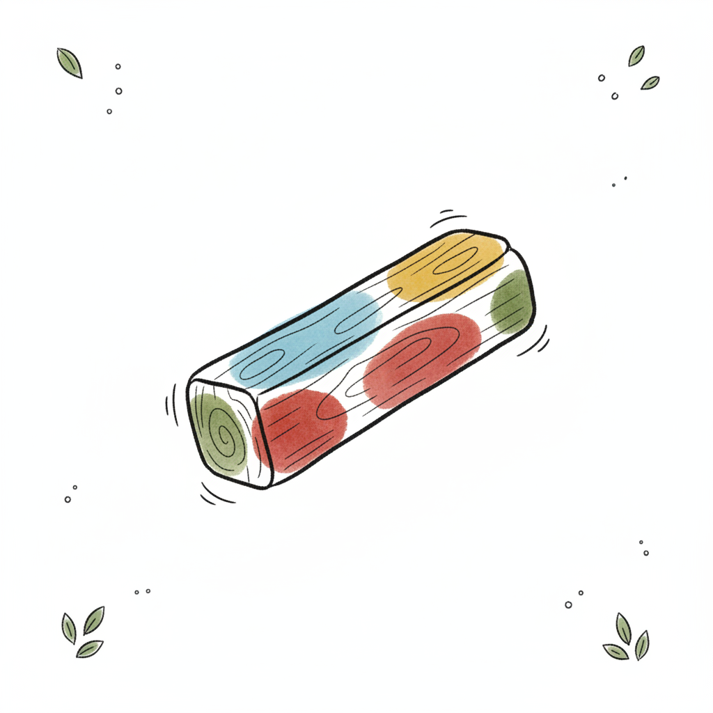 Illustrierter Holzklotz mit bunten, aquarellartigen Kreisen und Blättern auf weißem Grund.