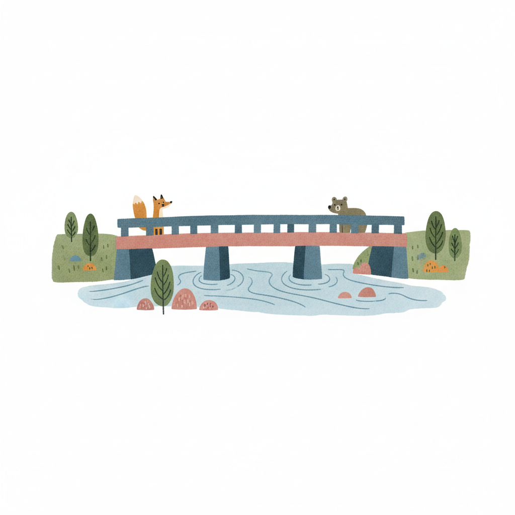 Niedliche Illustration: Fuchs und Bär auf einer Brücke über einem Fluss mit Bäumen.