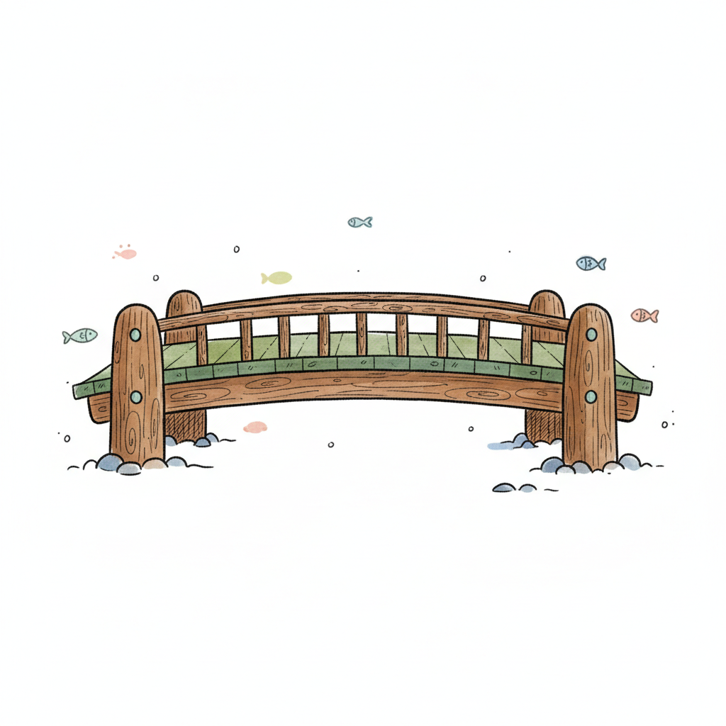 Niedliche Cartoon-Illustration einer hölzernen Brücke mit grünen Akzenten und schwimmenden Fischen.