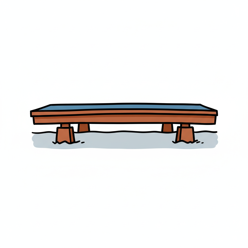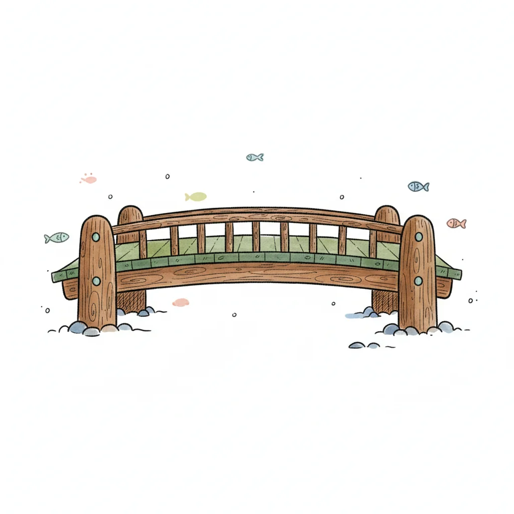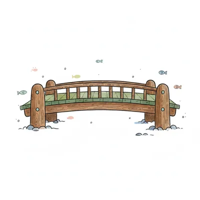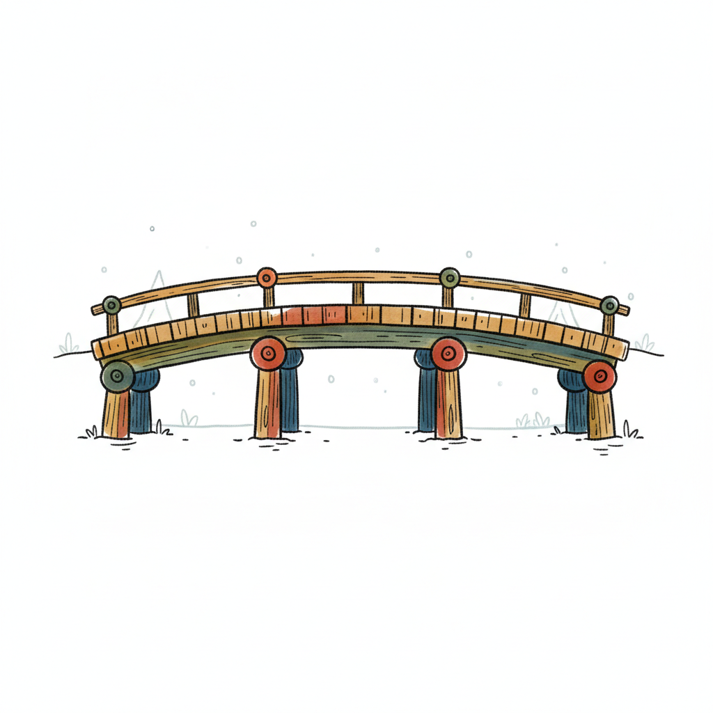 Ein handgezeichnetes, gewölbtes Holzbrücke im Cartoon-Stil mit bunten Details auf weißem Hintergrund.