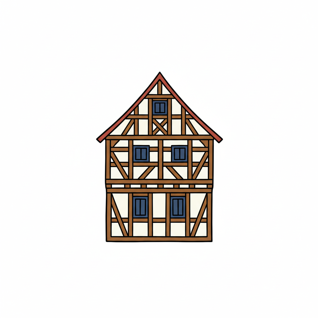 Illustration eines Fachwerkhauses mit rotem Dach, braunen Balken und blauen Fenstern auf weißem Grund.