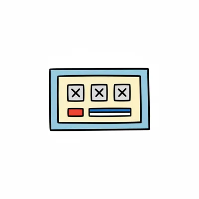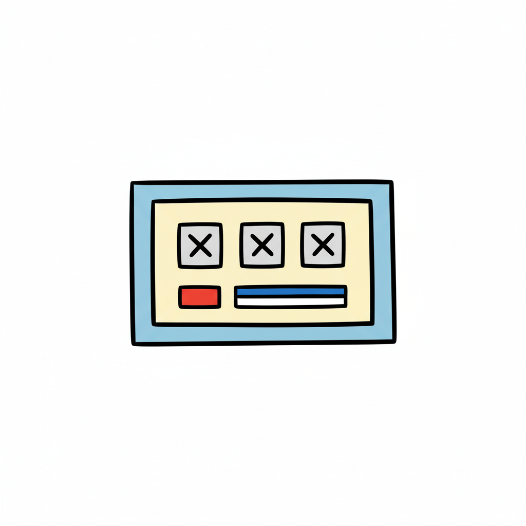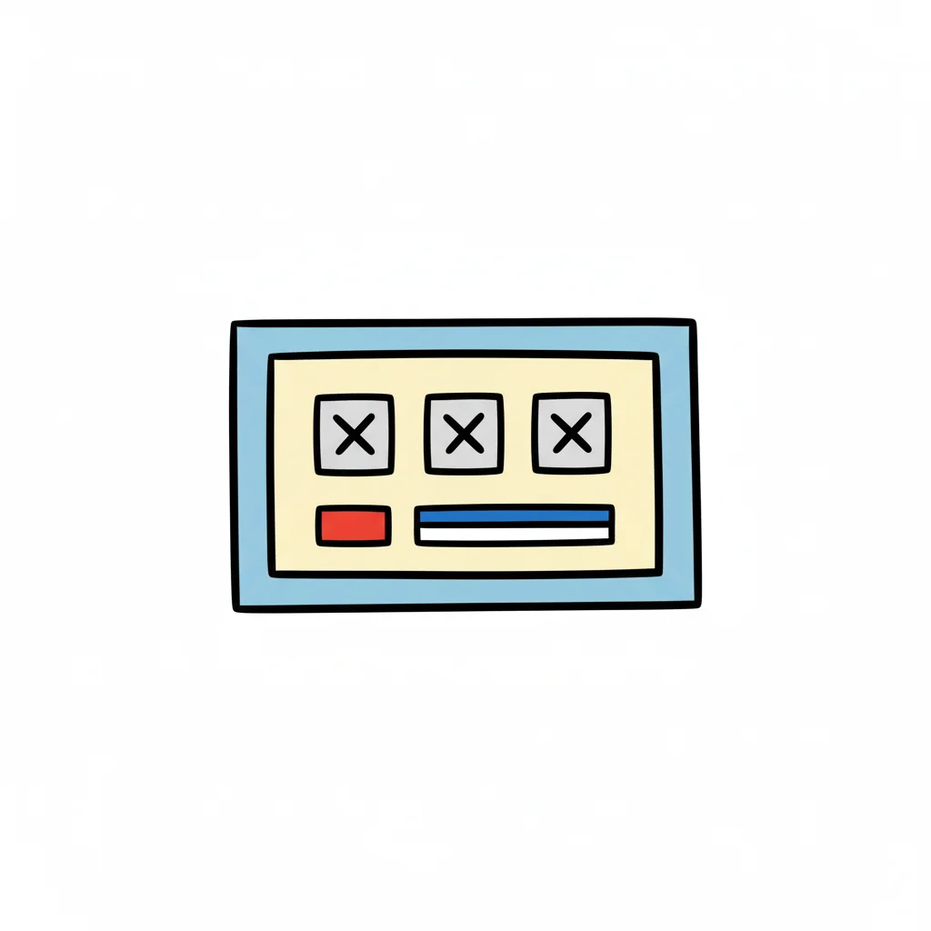 Buntes, handgezeichnetes Computerfenster mit X-Symbolen, rotem Feld und blauem Fortschrittsbalken.