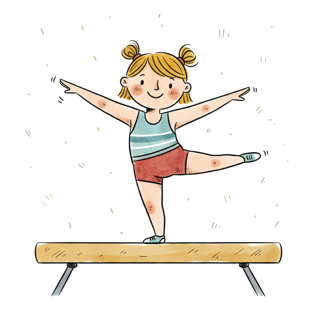 Lächelndes Cartoon-Mädchen balanciert auf einem Schwebebalken, Arme ausgebreitet.