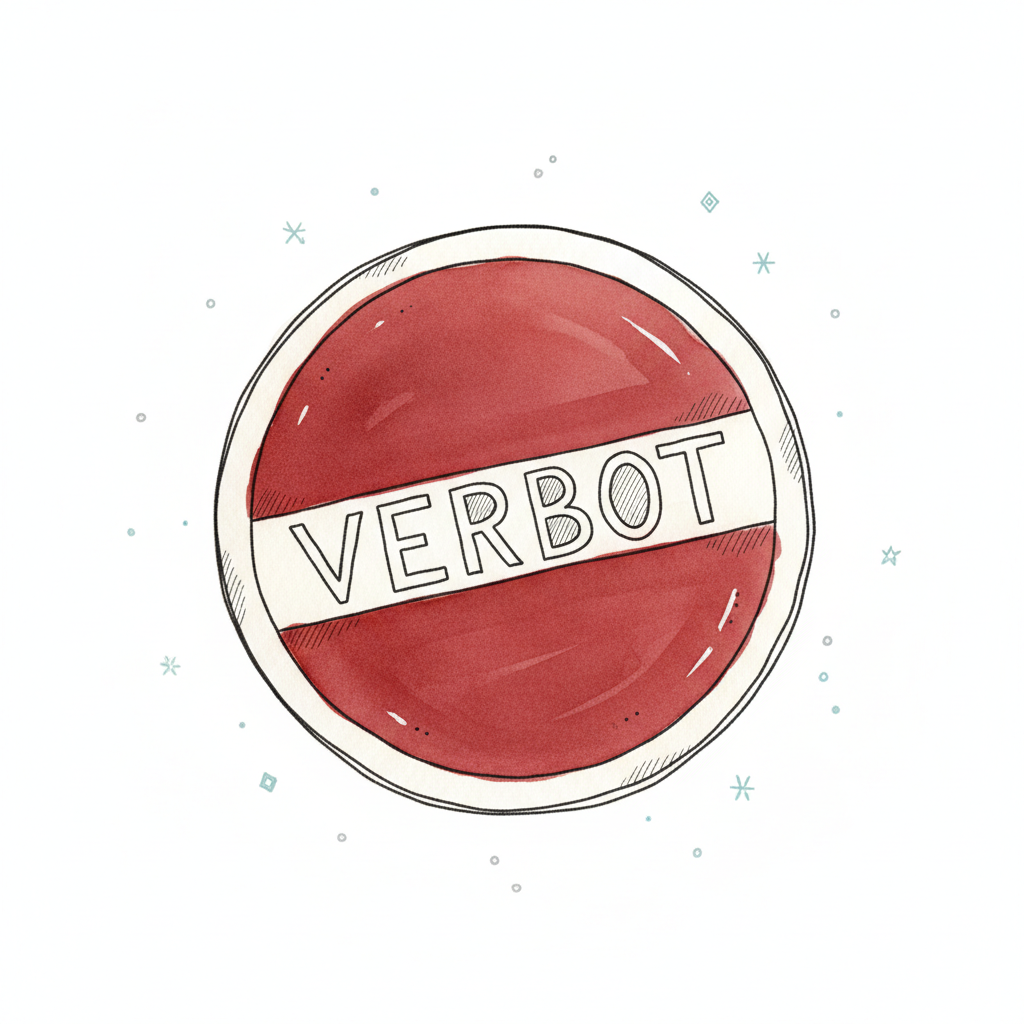 Handgezeichnetes rotes Verbotsschild mit weißem Balken und dem Wort 'VERBOT'.