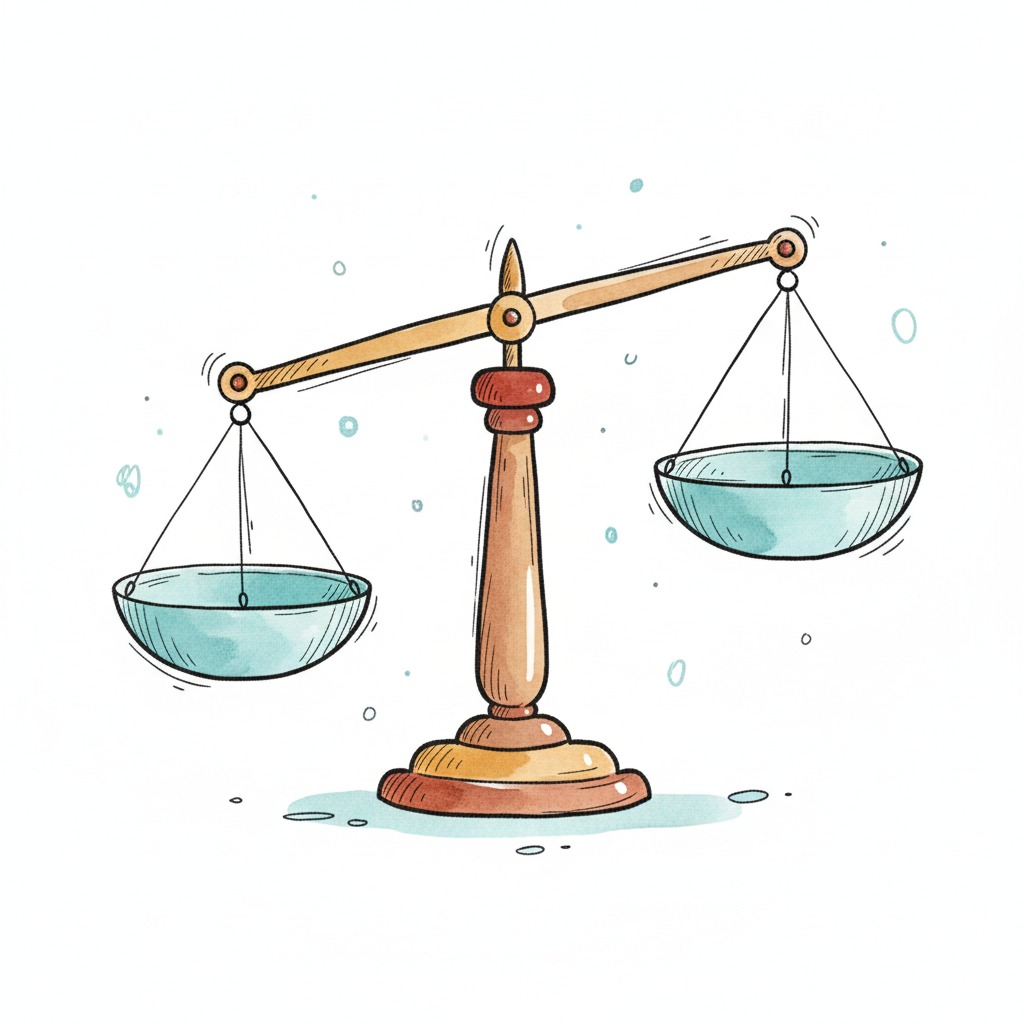 Aquarell-Illustration einer ungleichen Balkenwaage mit blauen Schalen, die Ungleichgewicht darstellt.