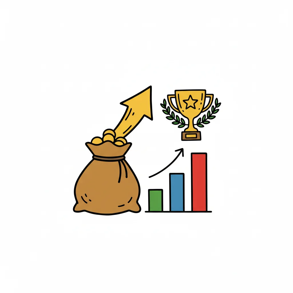 Geldbeutel, steigende Balken und Pokal symbolisieren finanzielles Wachstum und Erfolg.
