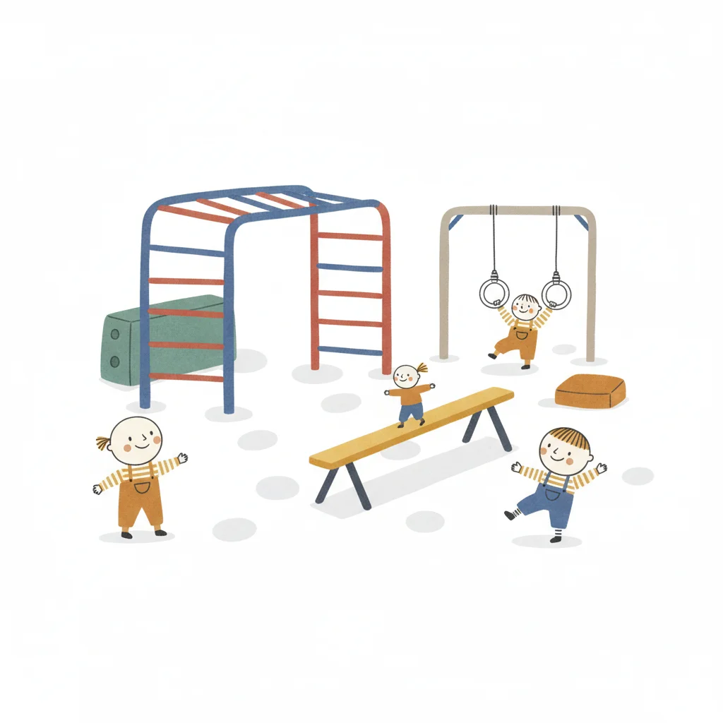 Fröhliche Kinder spielen auf einem Spielplatz mit Klettergerüst, Ringen und Balancierbalken.