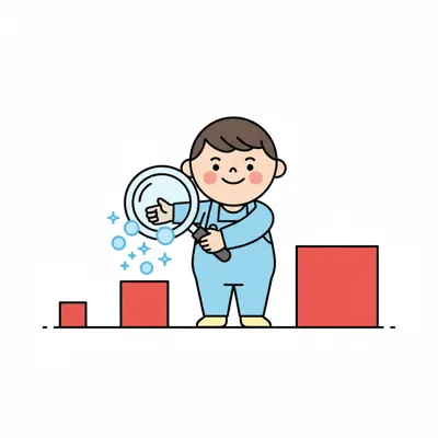 Cartoonfigur mit Lupe, die einen Daumen hoch über einem steigenden Balkendiagramm zeigt.