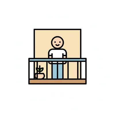 Eine Person steht lächelnd auf einem Balkon mit einer Pflanze.
