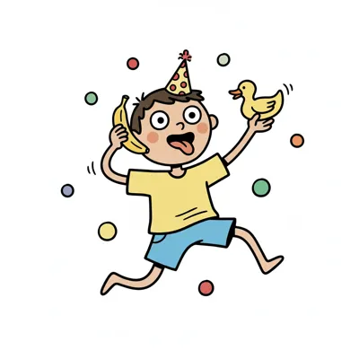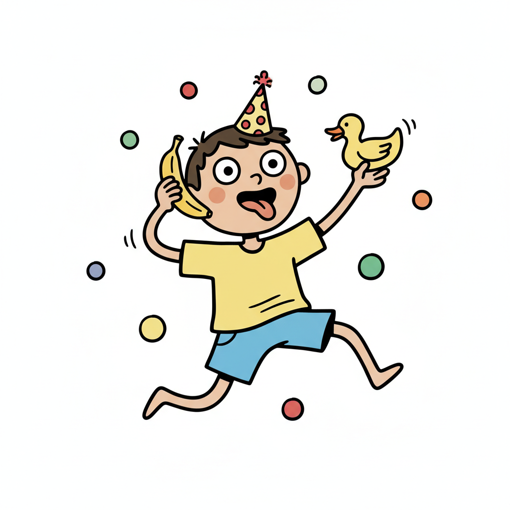 Junge mit Partyhut, Banane und Gummienten tanzt fröhlich.