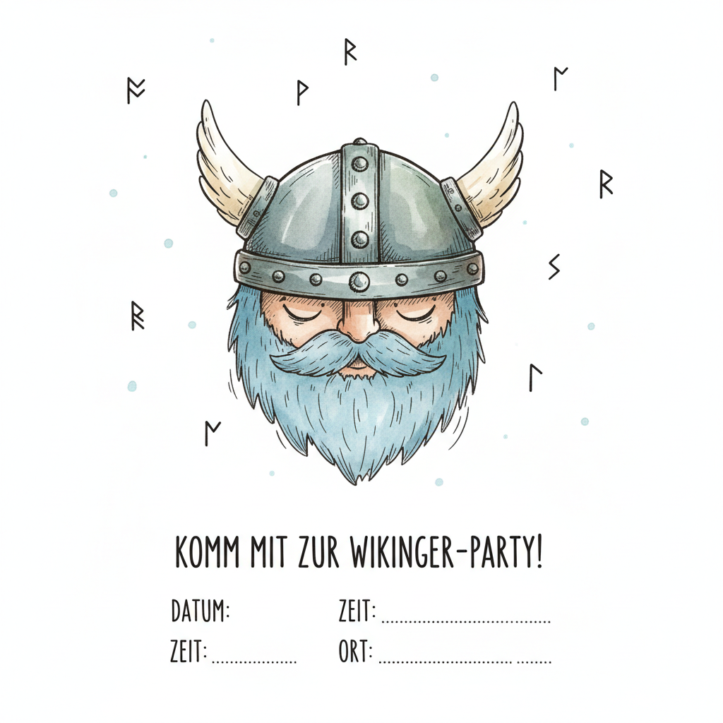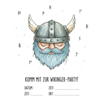 Einladung zur Wikinger-Party mit Illustration eines Wikingers mit Helm und blauem Bart.