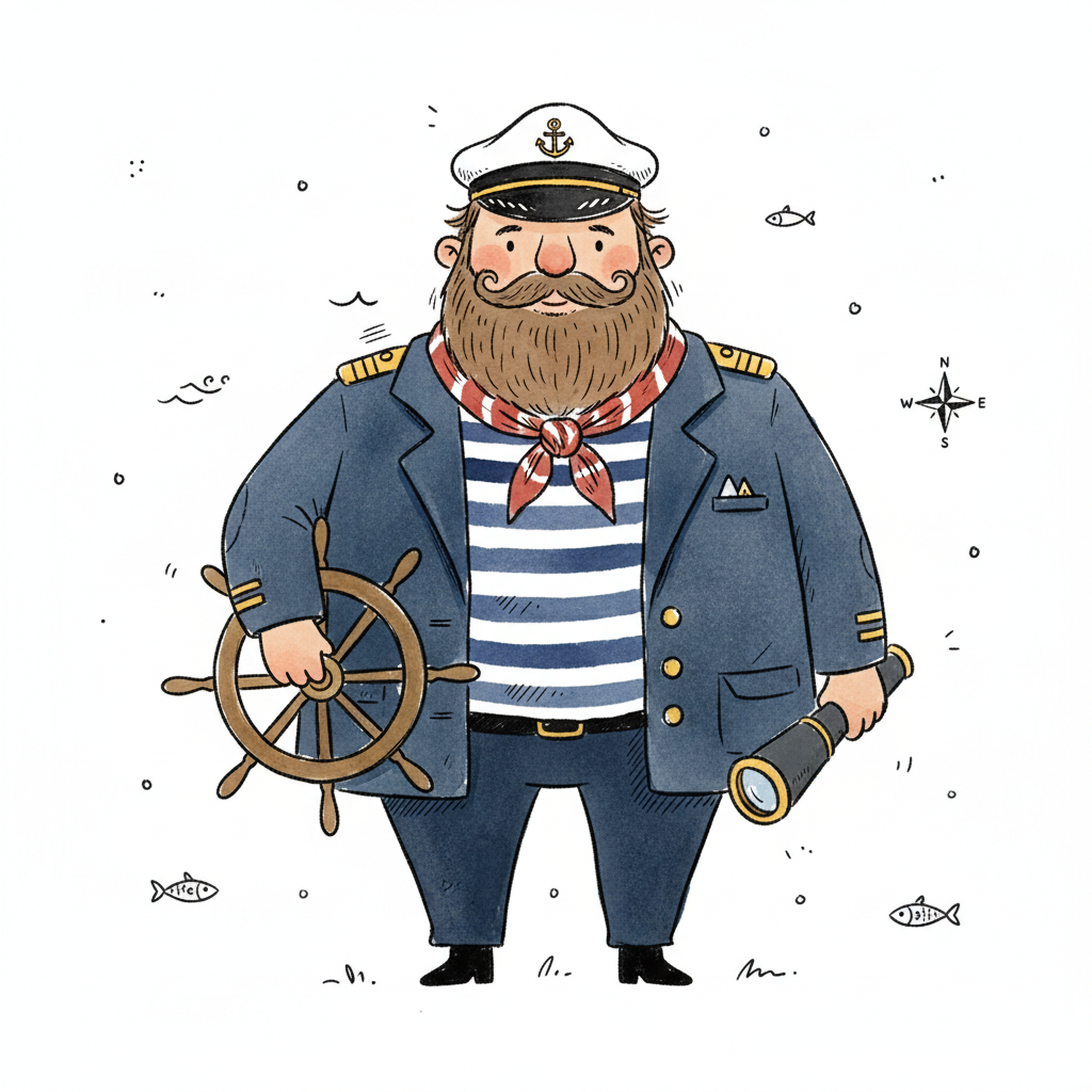Illustrierter Kapitän mit Bart, Mütze, Steuerrad und Fernrohr in nautischer Szene.