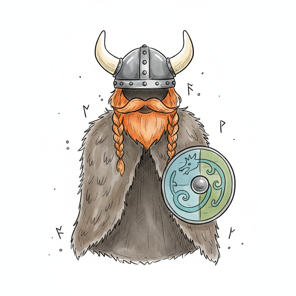 Cartoon-Viking mit Helm, rotem Zopf-Bart, Fellumhang und Drachenschild, umgeben von Runen.