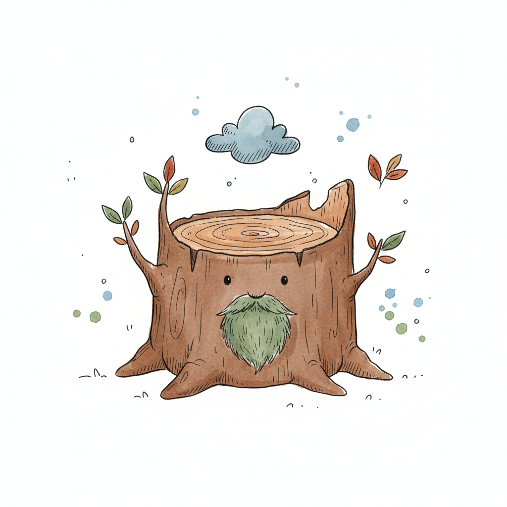 Ein freundlicher, anthropomorpher Baumstumpf mit grünem Bart und Blättern, darüber eine Wolke.