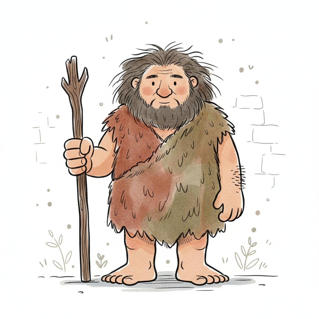 Freundlicher Cartoon-Höhlenmensch mit Bart, Fellkleidung und Stock.