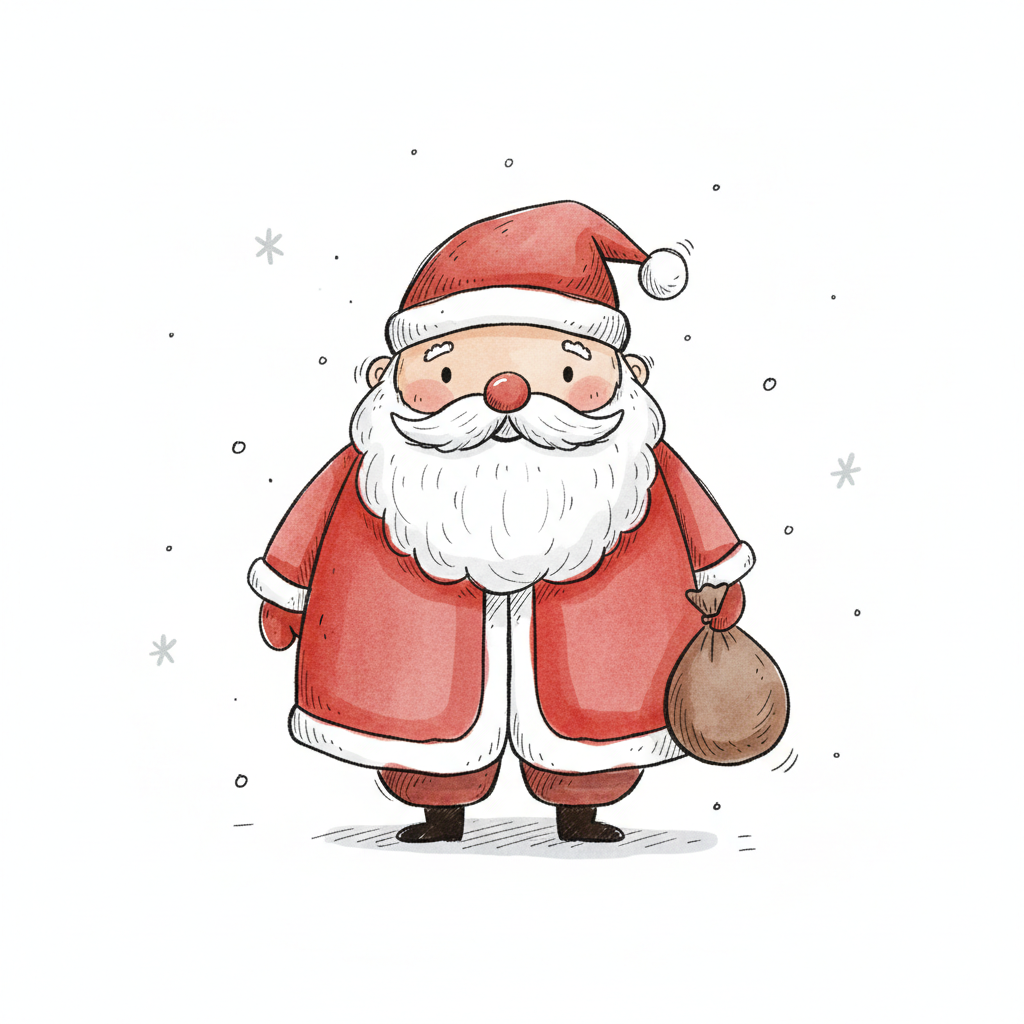 Niedlicher Cartoon-Weihnachtsmann mit rotem Anzug, weißem Bart und Geschenksack, umgeben von Schneeflocken.