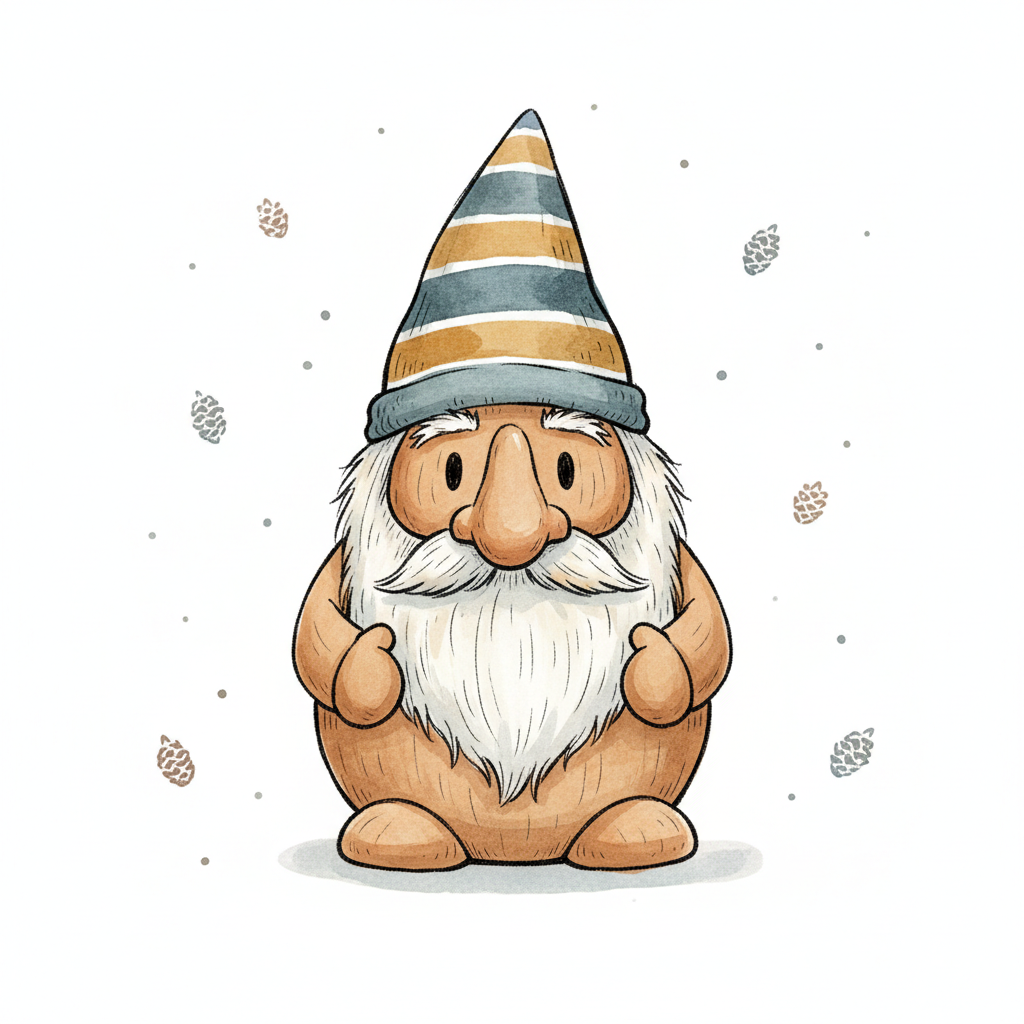 Niedlicher Cartoon-Gnom mit gestreifter Mütze und weißem Bart, umgeben von Tannenzapfen.