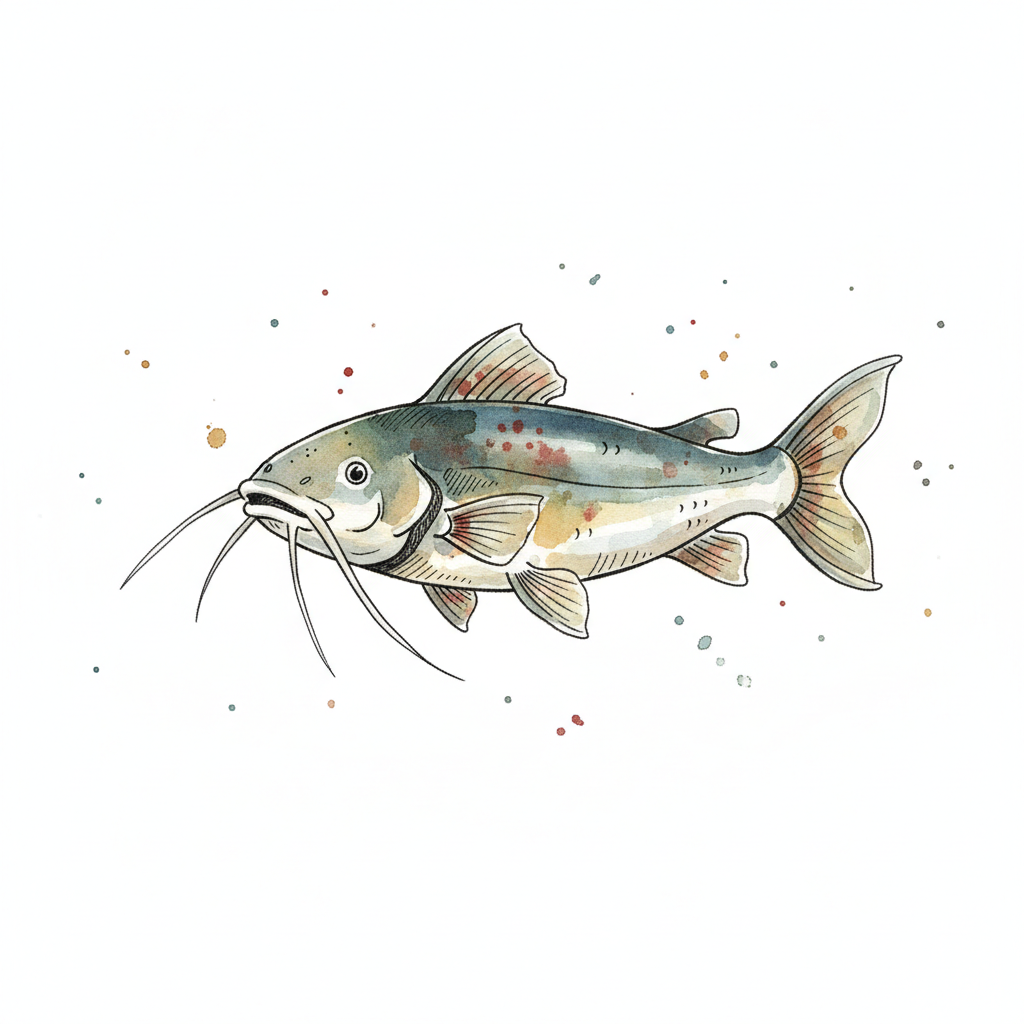 Aquarellzeichnung eines Welses mit Barteln und Farbspritzern auf weißem Hintergrund.