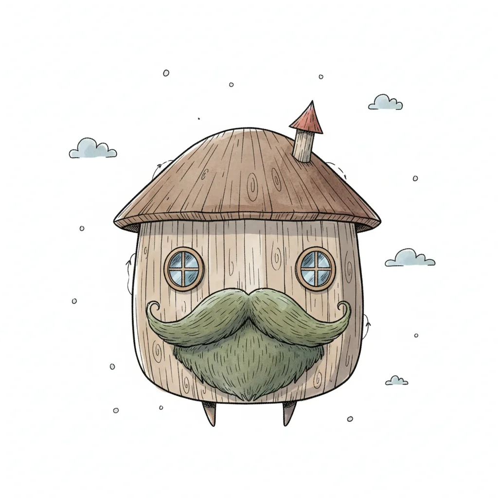 Ein skurriles, hölzernes Haus mit Augen, Schnurrbart und Bart, schwebend unter kleinen Wolken.