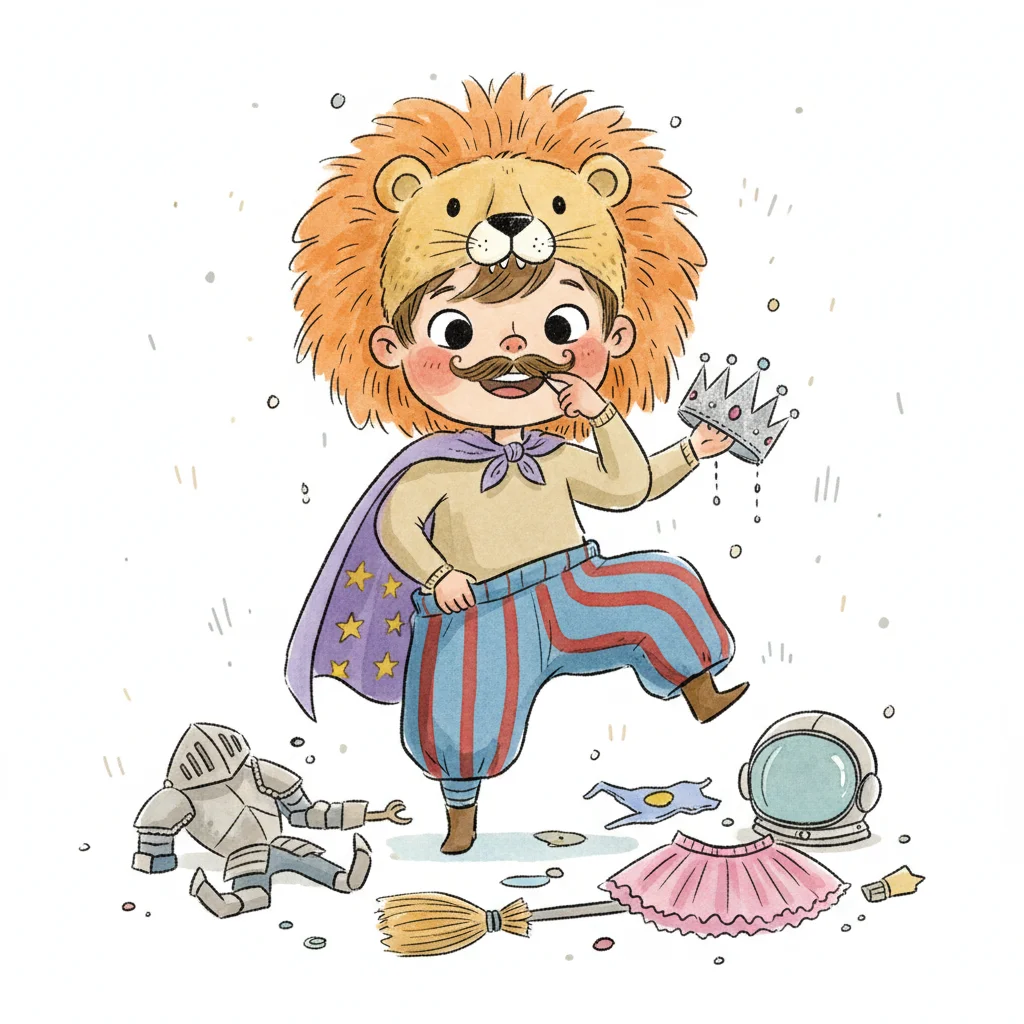 Ein Kind in Löwenmütze, Schnurrbart und Umhang spielt inmitten von Spielzeug und Kostümen.