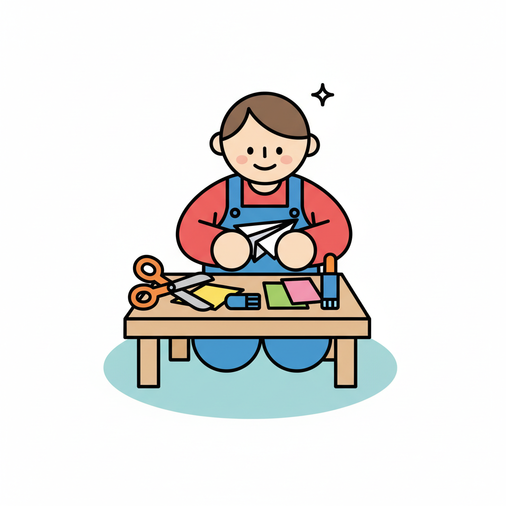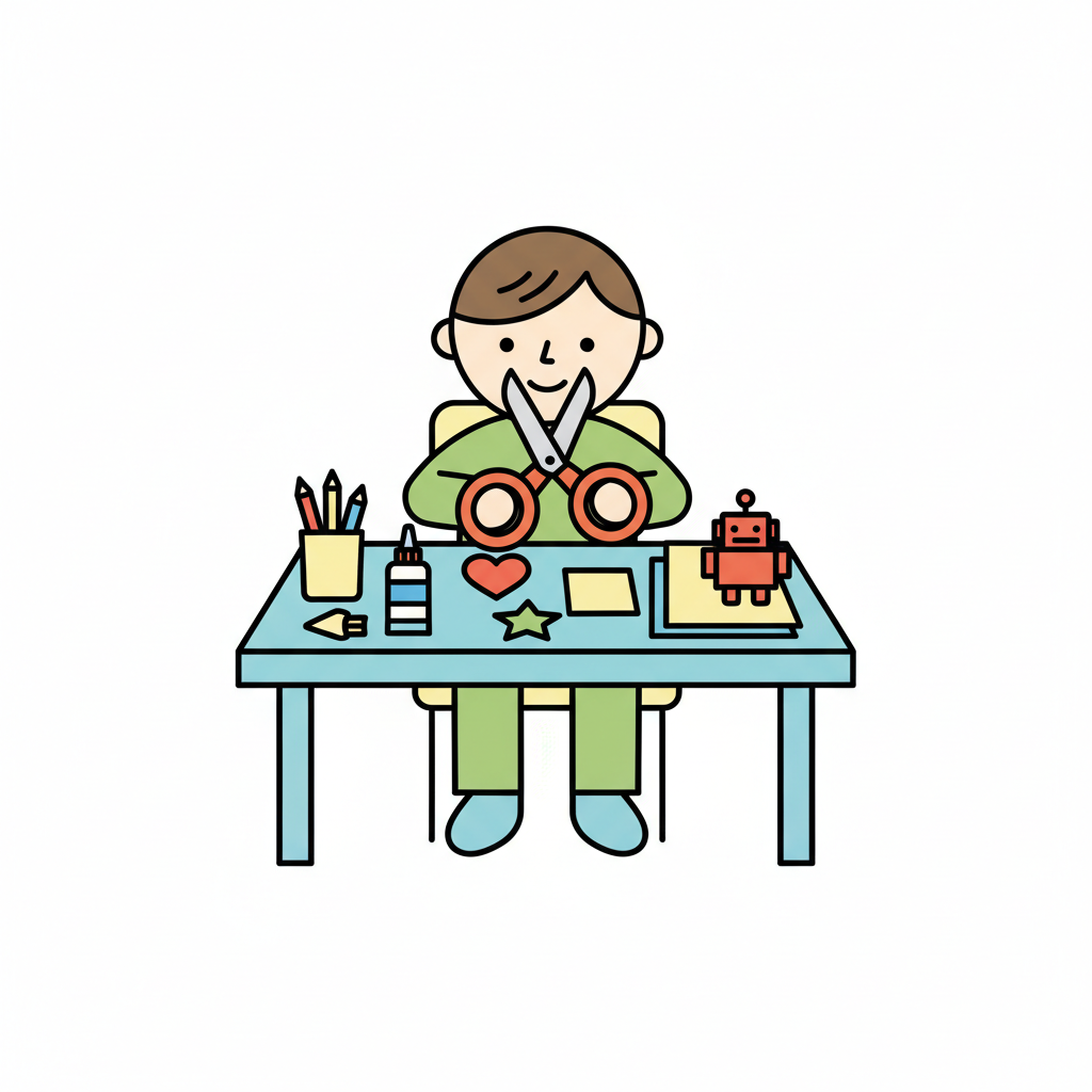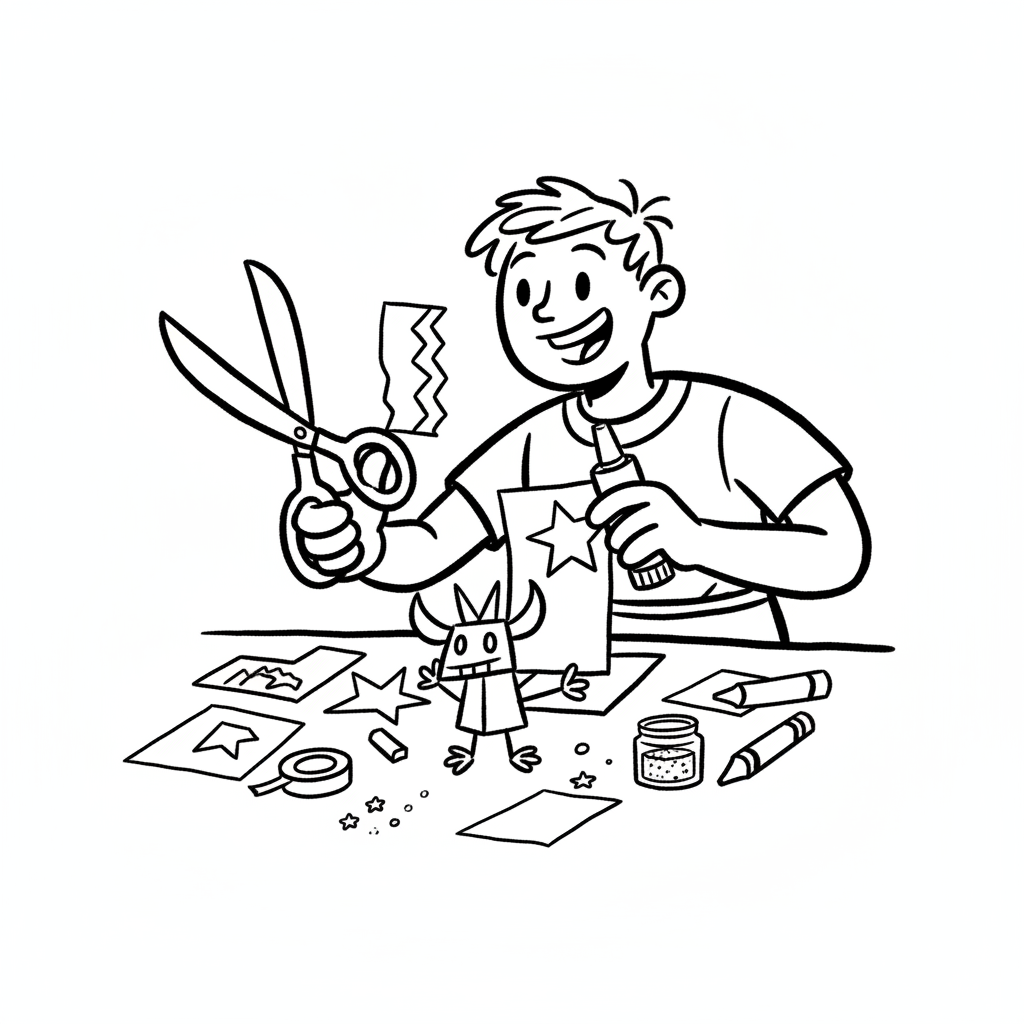 Junge bastelt mit Schere und Kleber eine kreative Figur aus Papier.