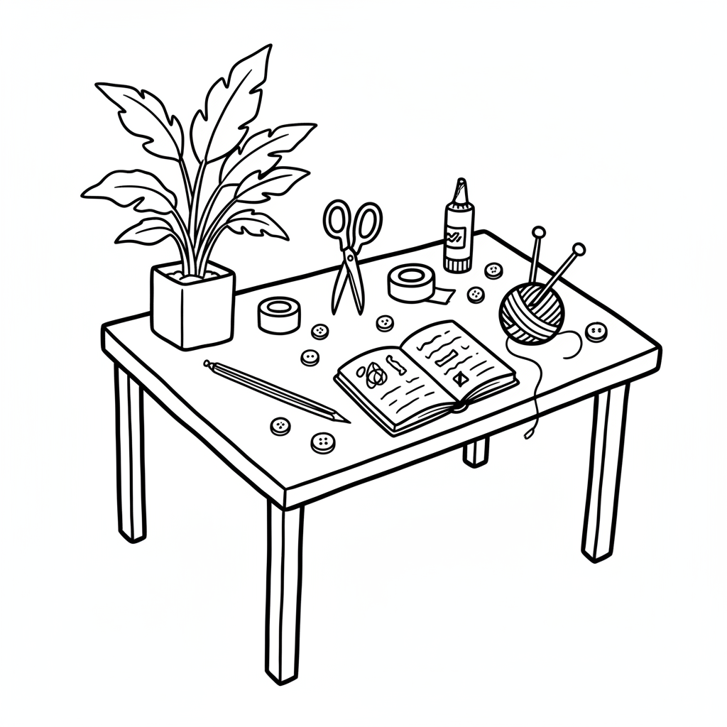 Ein Tisch mit Pflanze, Schere, Garn, Knöpfen und einem Buch.
