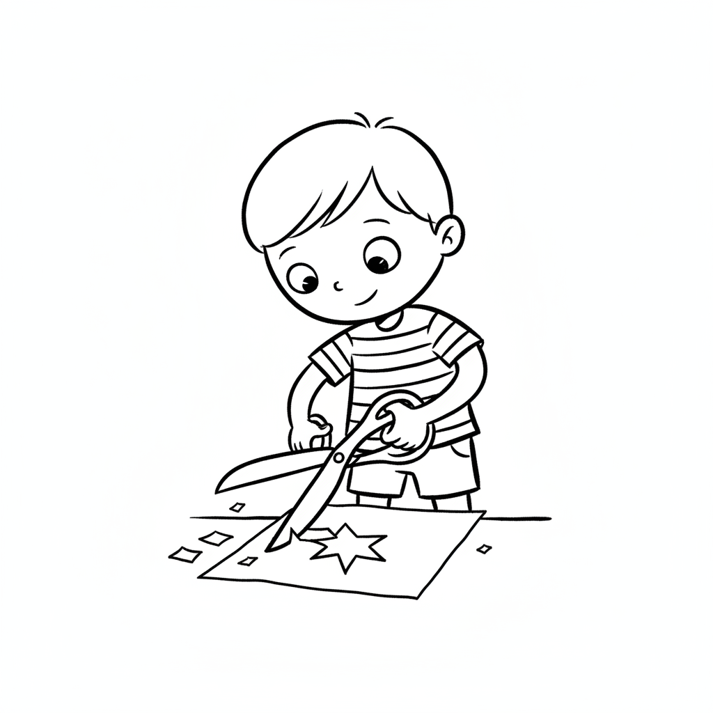 Ein Junge schneidet mit einer Schere ein Papier mit einem Stern aus.