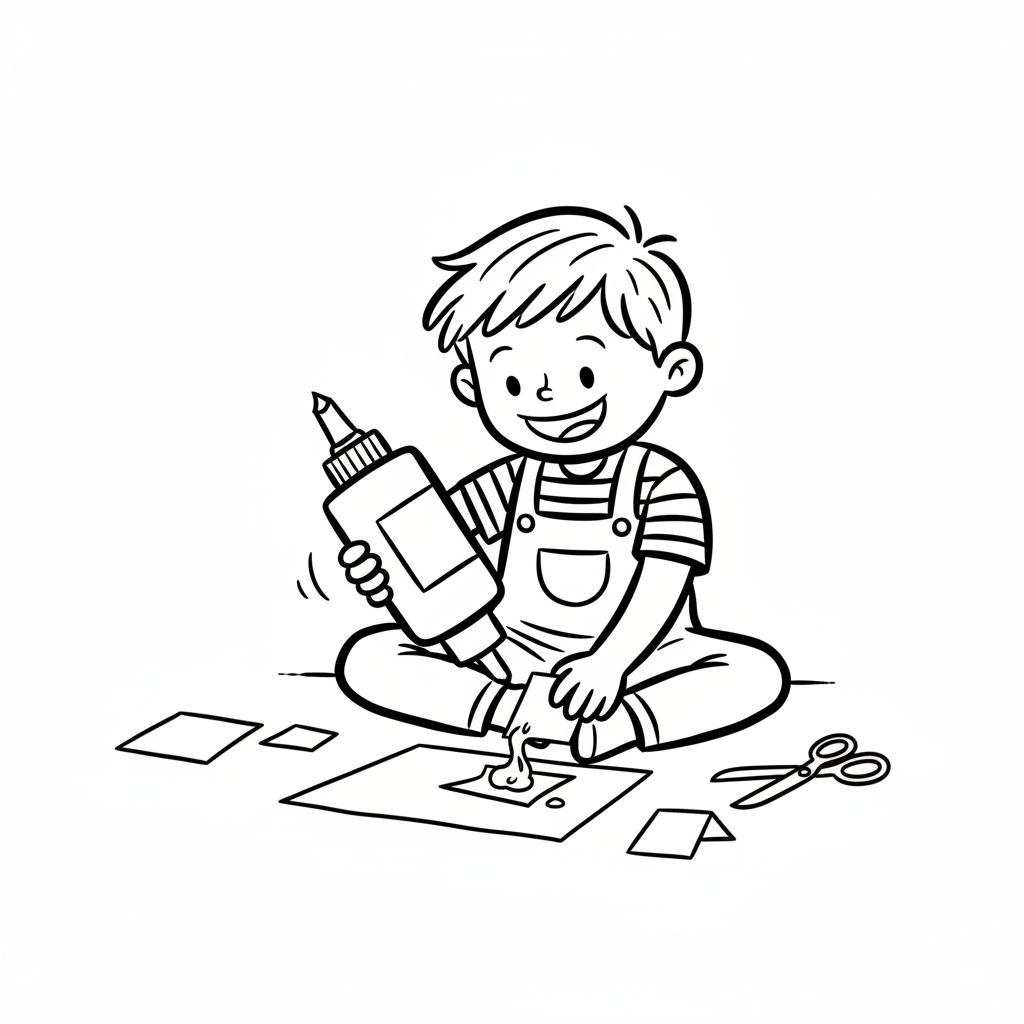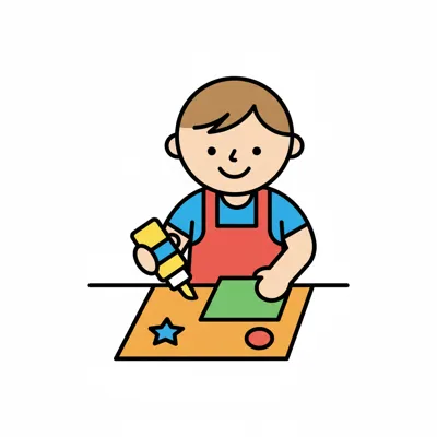 Ein Junge sitzt und bastelt mit Kleber, Papier und Schere.