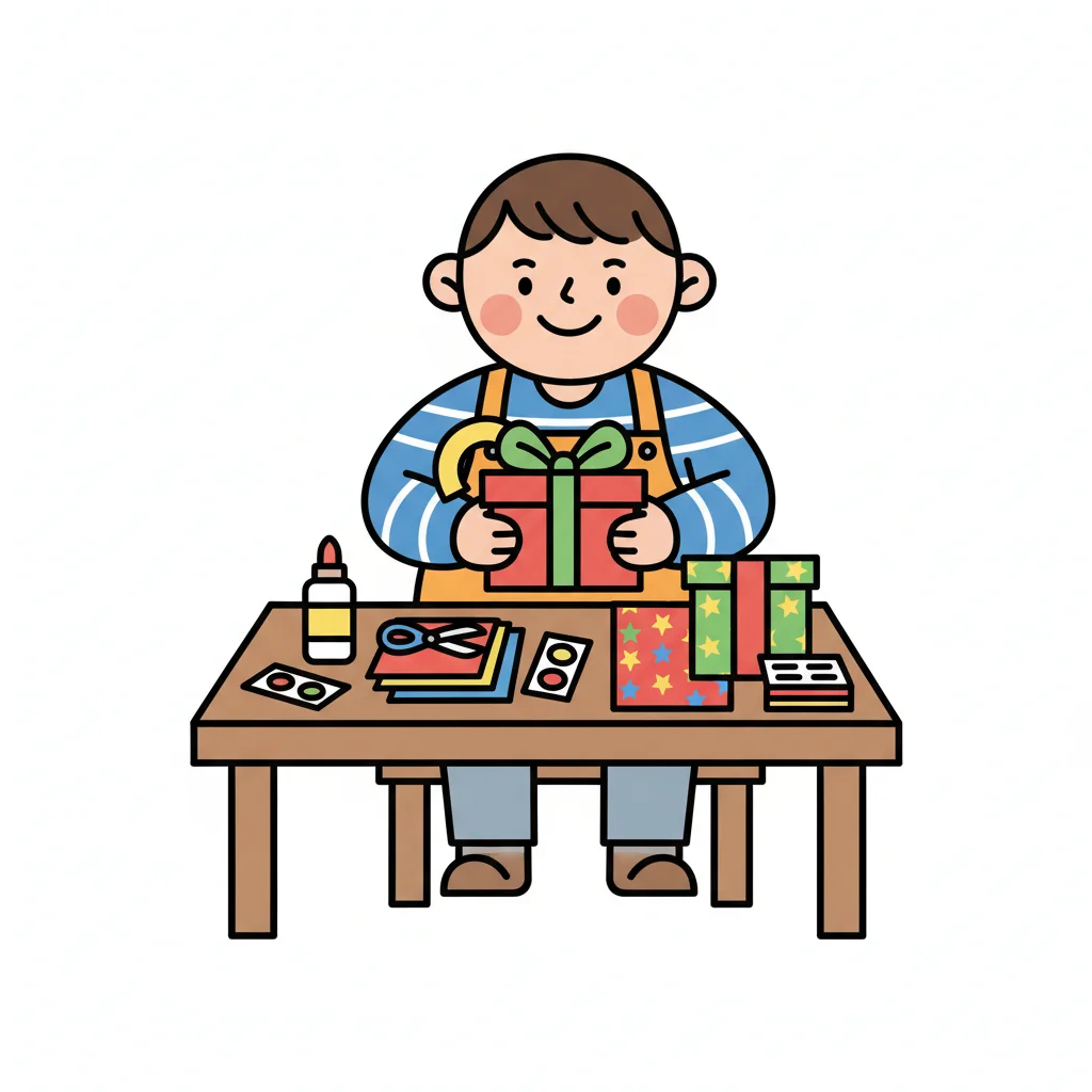 Ein Junge bastelt ein Geschenk an einem Tisch mit Bastelmaterialien.