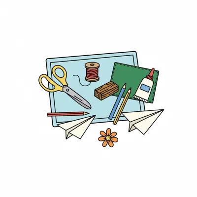 Ein Tisch mit Bastelmaterialien und einer niedlichen Animation von einem Fuchs.