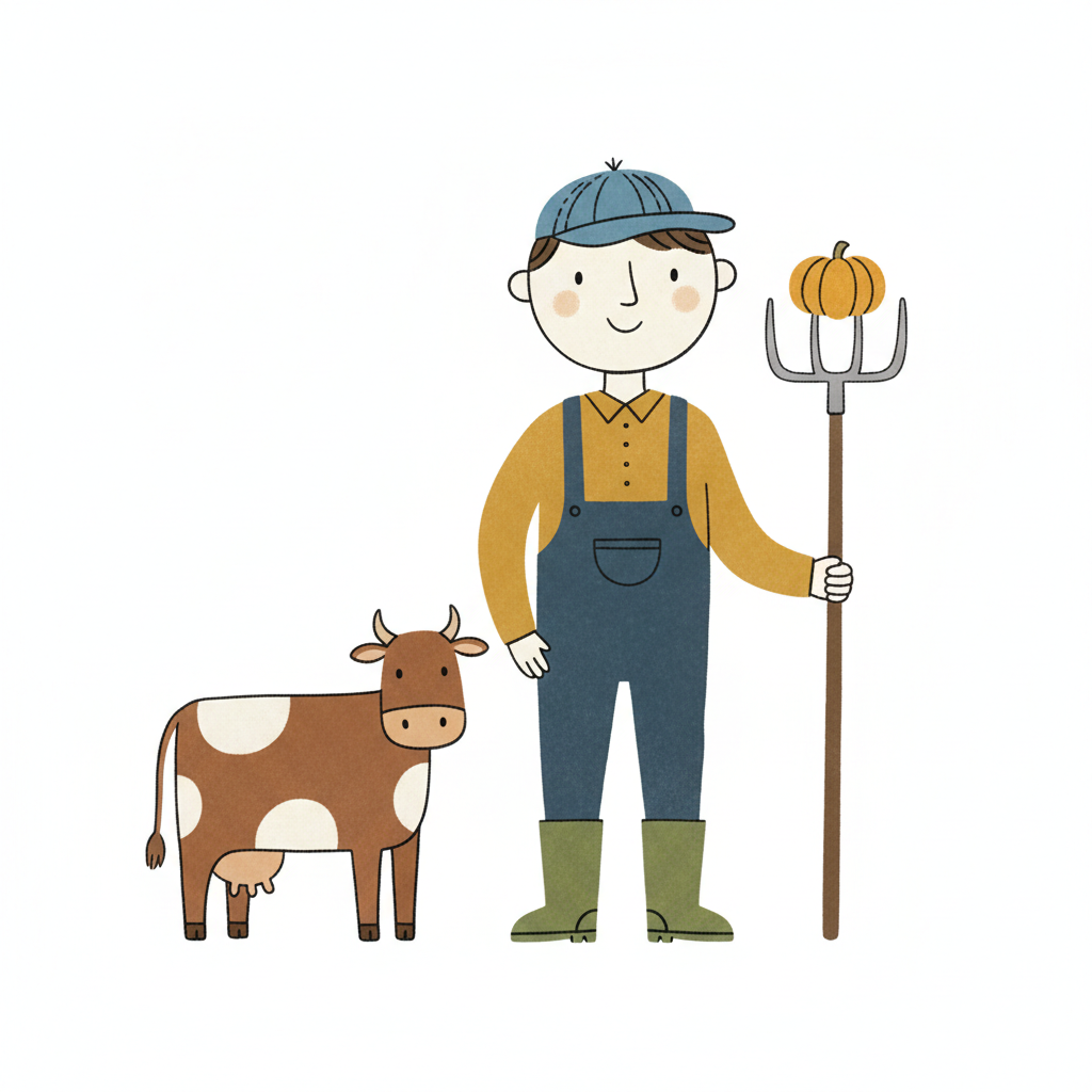 Ein Bauer mit einer Kuh und einer Forke, freundlich und cartoonhaft gezeichnet.