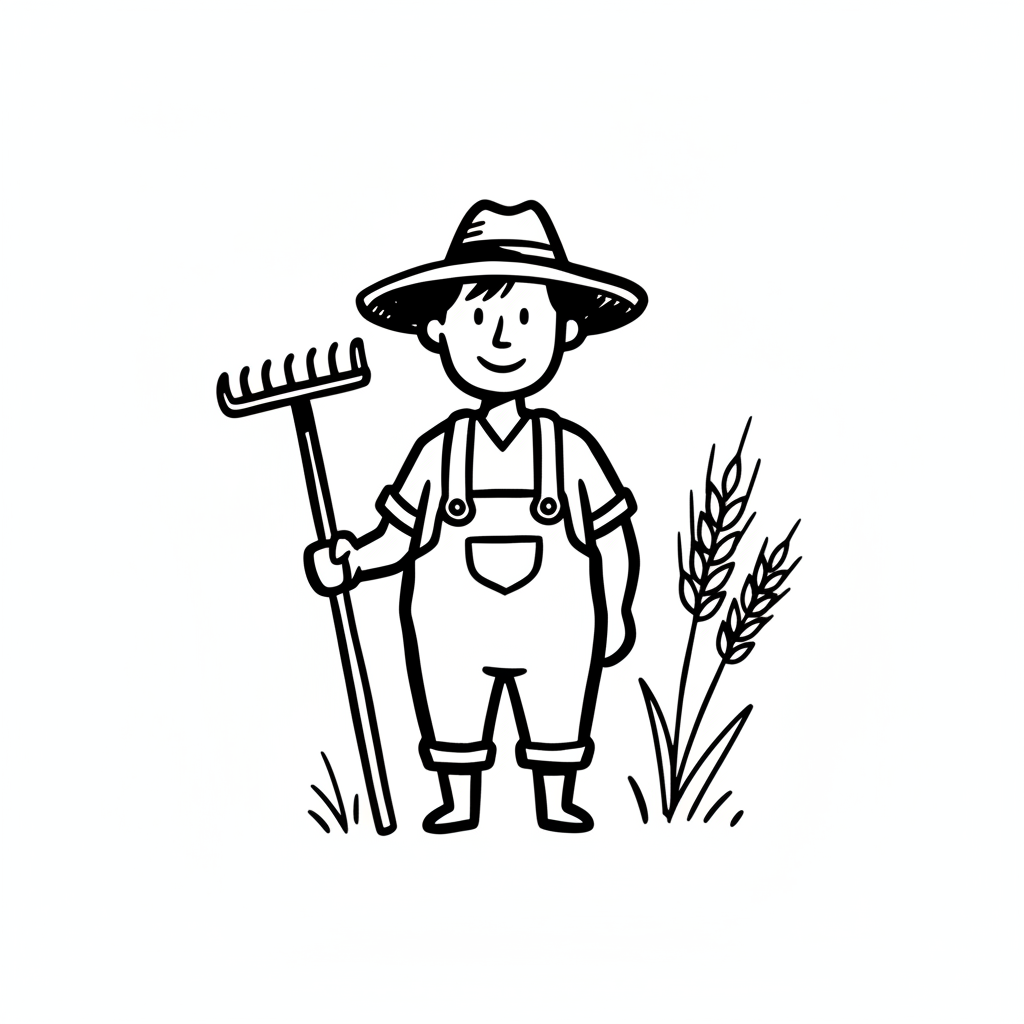 Ein Bauer mit einer Heugabel trägt einen Hut und Latzhose.