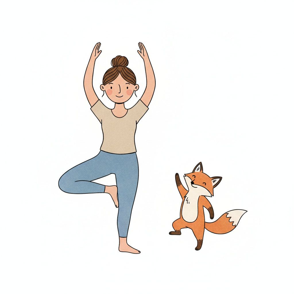 Eine Frau in Yoga-Baum-Pose mit einem fröhlichen Fuchs daneben. Süße Illustration.