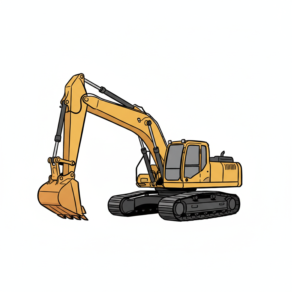 Illustration eines gelben Baggers mit Schaufel und Kettenfahrwerk auf weißem Hintergrund.